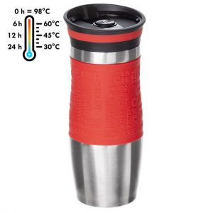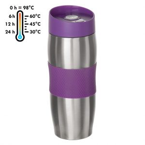 ₴522.11 – ₴522.11Термочашка з подвійними стінками з нержавіючої сталі. Надійна пластикова кришка з кнопкою OPEN/CLOSE та отвором для пиття. Для зручності утримання в руці чашка має силіконову вставку. Об'єм: 380 мл. Індивідуальна упаковка - картонна коробочка (розмір коробочки: 205 x 80 x 80 мм). Колірна лінійка (найближчі кольори за шкалою Pantone): салатовий - 7491 C, блакитний - 7703 C, фіолетовий - 257 C, червоний - 194 C.- Вага: 0.276