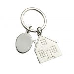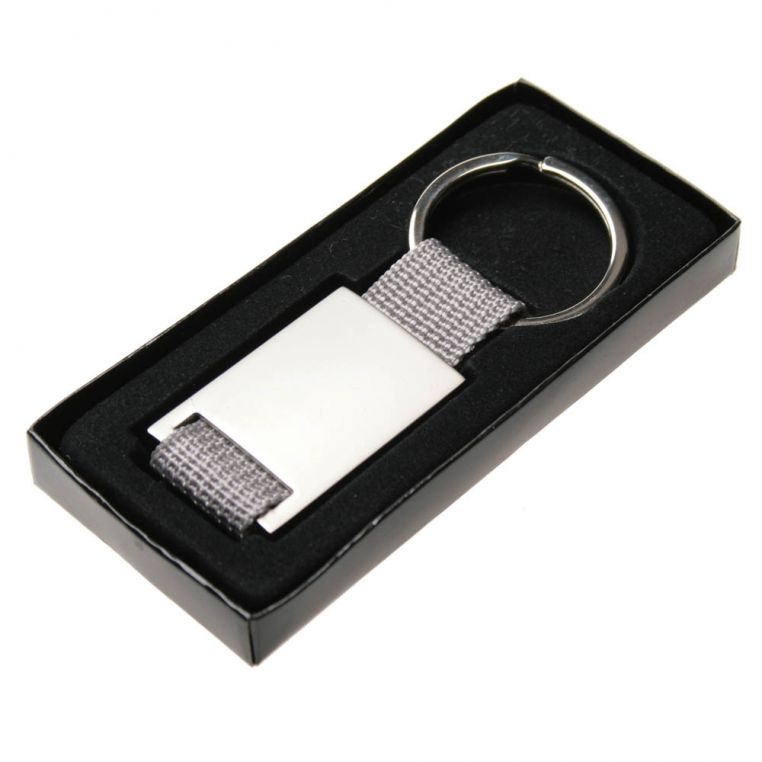 Металевий брелок з тасьмою. Зручний для нанесення зображення методом лазерного гравіювання. Оснащений металевим кільцем для ключів.
