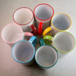 Друк на горнятах з білим покриттям, тоді як внутрішня сторона і ручка кольорові. Кількість кольорів – 9, ціна трохи вище, ніж на білі кружки, але оригінальний і привабливий вигляд чашок того вартує.