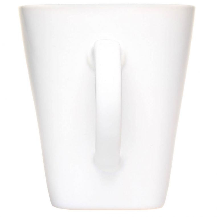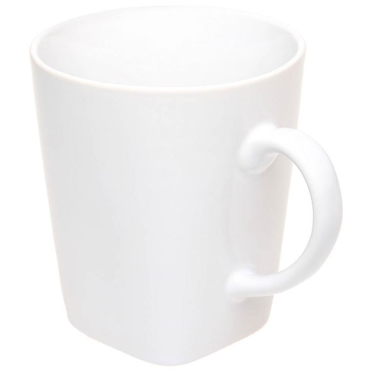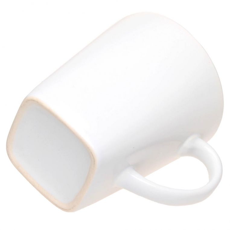 Керамічна чашка з квадратним дном. Повністю глянцева, нижній торець чашки з матовою глазур’ю. Витримує високотемпературний випал, що дозволяє наносити зображення методом обпалювальної деколі. Поле нанесення на внутрішній поверхні чашки можливе тільки у верхній чверті виробу.