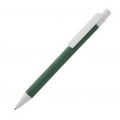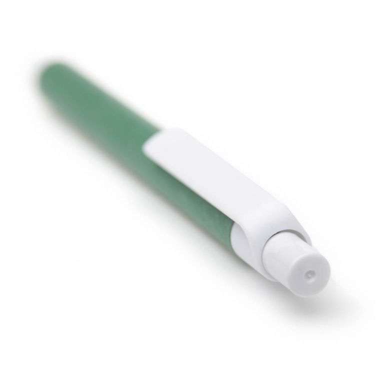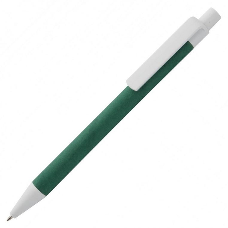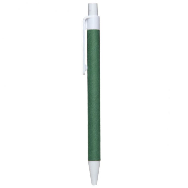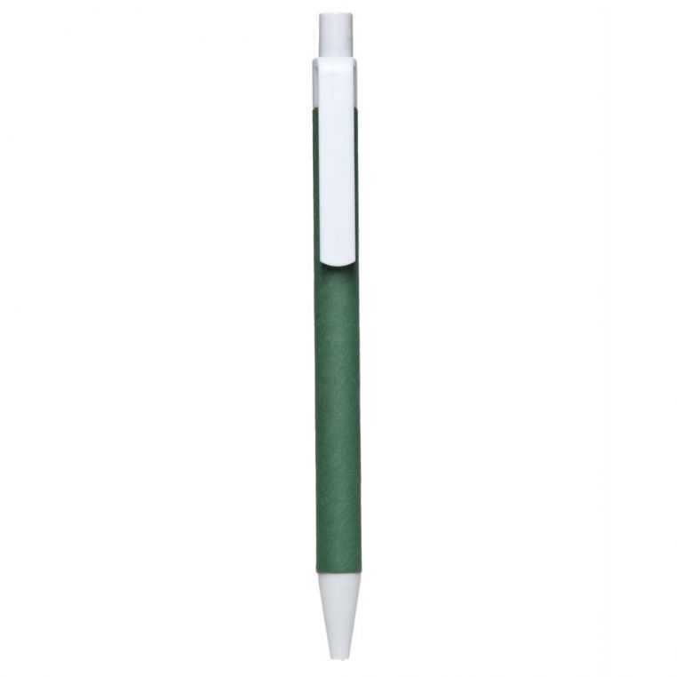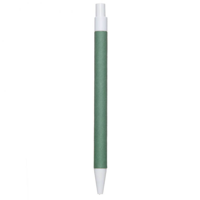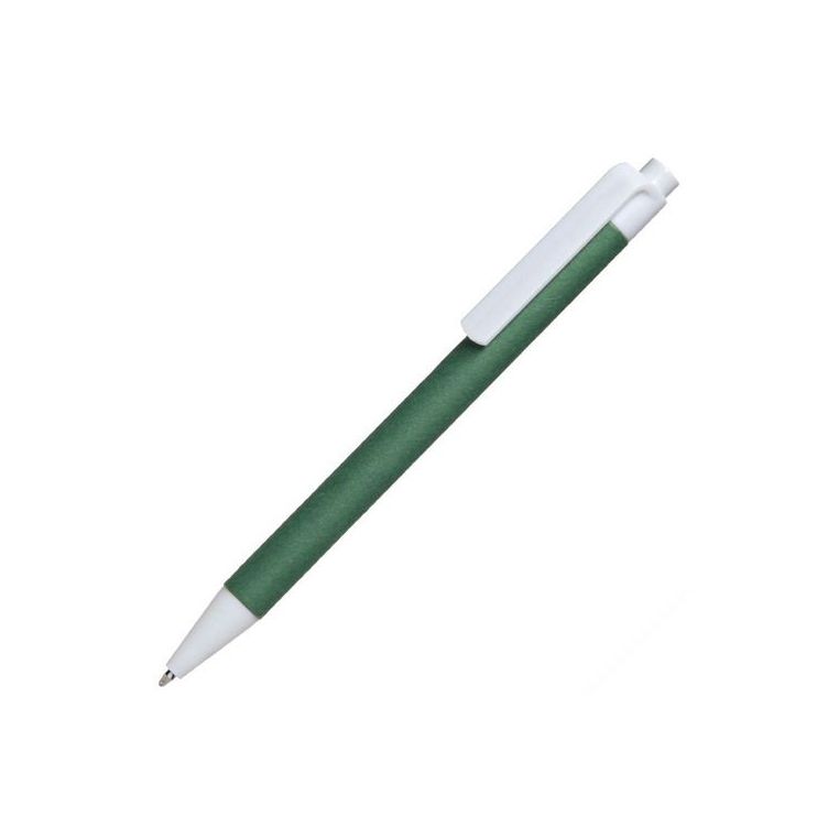Одноразова кулькова ручка з переробленого картону з білими пластиковими елементами. Механізм – кнопковий.