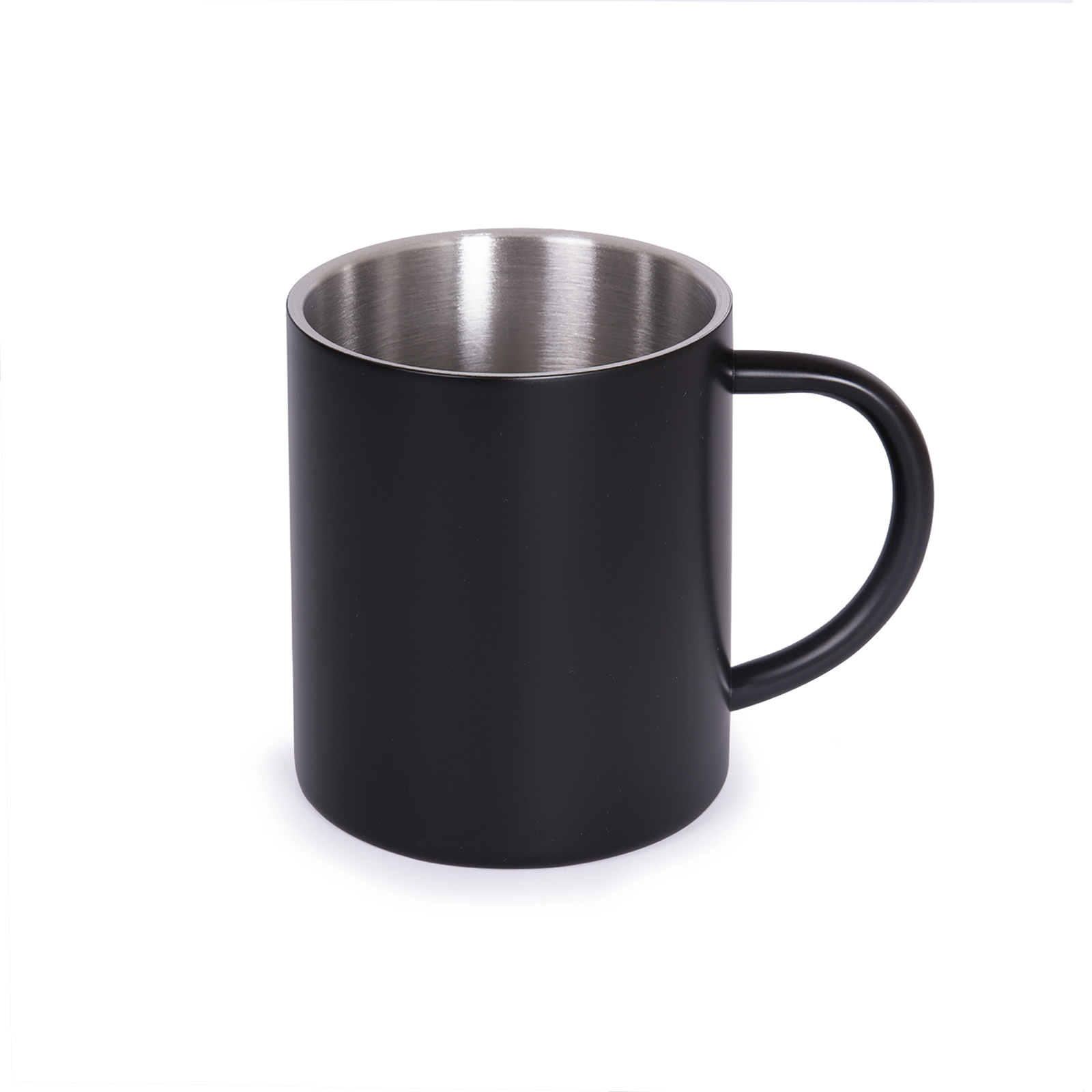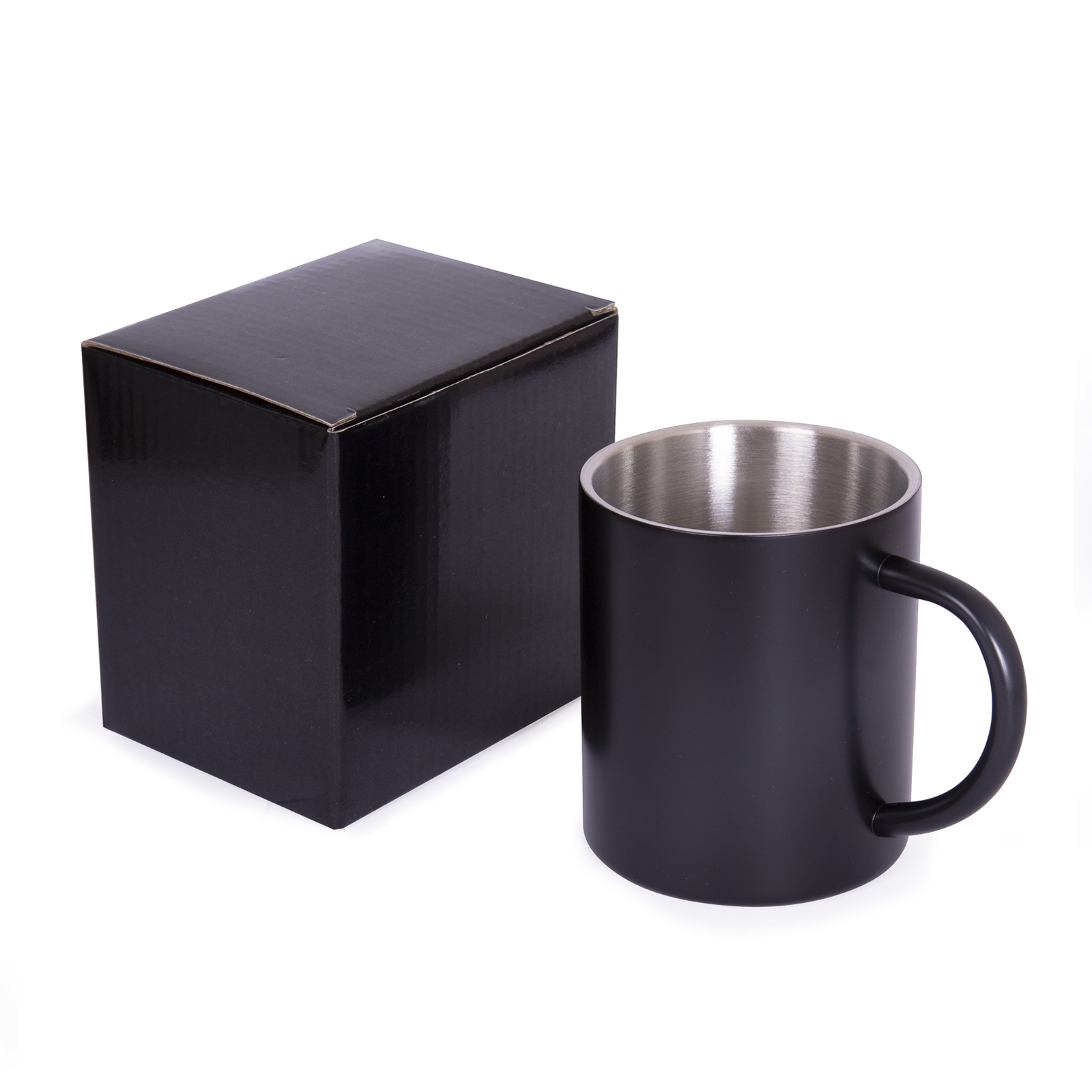 Кружка металева з двома стінками: срібляста – з глянцевим покриттям, колорові (чорна та синя) – з матовим покриттям. Висота 9,4 см