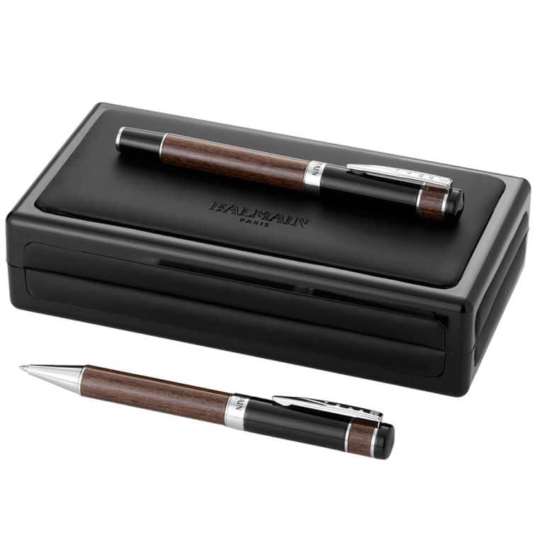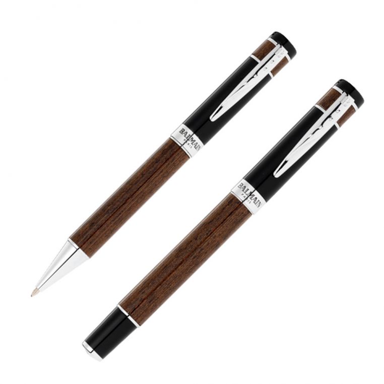Розкішний набір від Balmain, що складається з кулькової ручки та ручки-ролера. Набір упакований у подарунковий футляр. Ручки виготовлені з металу. Стильний класичний дизайн із декоруванням елементів під дерево. Механізм кулькової ручки – кнопковий. Роллер – без механізму, зі знімним ковпачком.