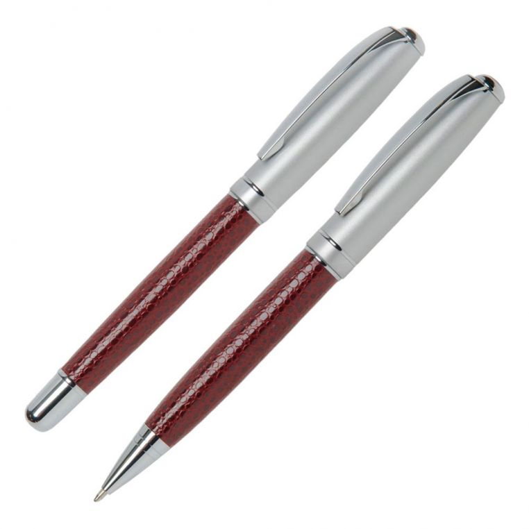 Набір якісних металевих ручок, що складається з кулькової ручки та ручки-ролера. Відмінною особливістю дизайну ручок є використання покриття, що імітує тиснену лакову шкіру. Набір упакований у м’який футляр зі штучної шкіри на блискавці.