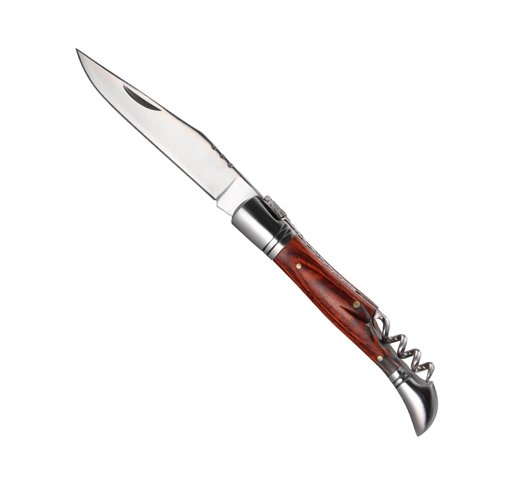 Ніж з високоякісної нержавіючої сталі, гострим лезом, має штопор. Тримач з дерев’яними вставками. Розмір леза 10 см, розмір в закритому стані 11,8Х2,5Х1,7 см.
