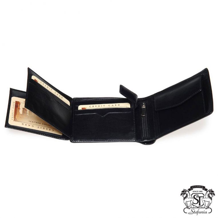 Чоловіче портмоне із натуральної шкіри. Містить два відділення для купюр, дві кишені, одну кишеню на блискавці, сім слотів для карток та три вікна для посвідчень.