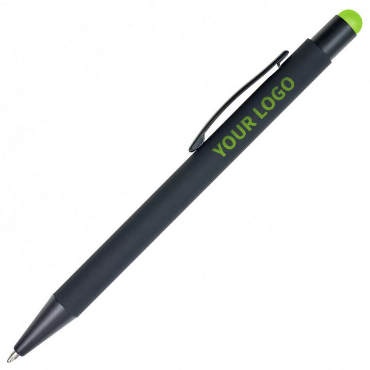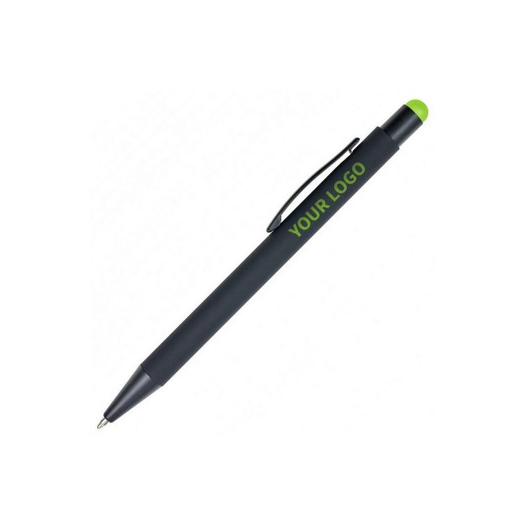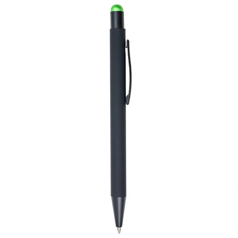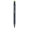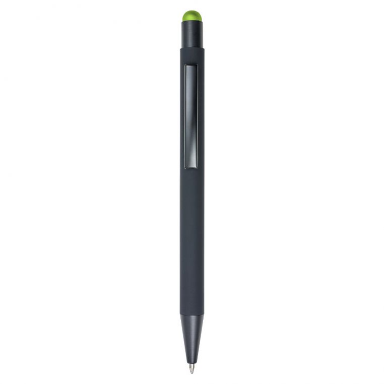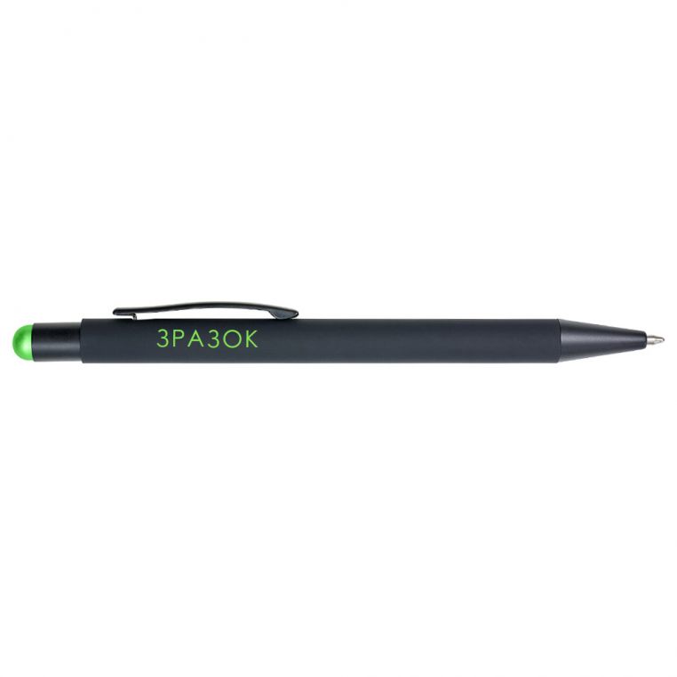 Кулькова прогумована ручка-стилус з алюмінію з кольоровим гумовим наконечником для роботи з сенсорним екраном. Кольорове гравіювання. Матеріали: алюміній, метал. Механізм – кнопковий.