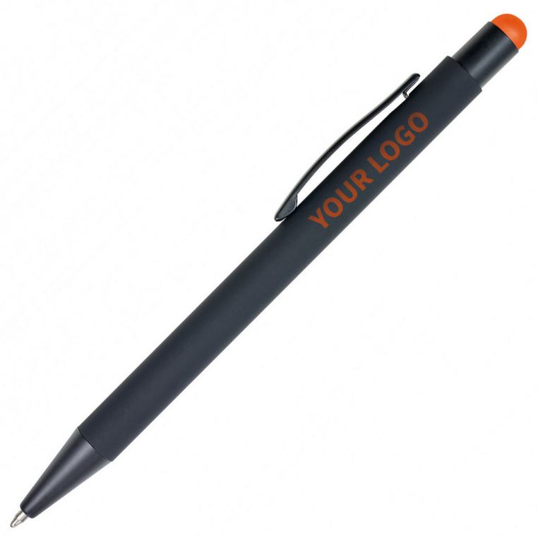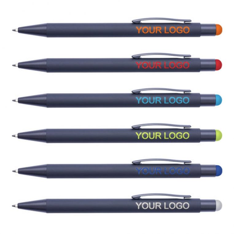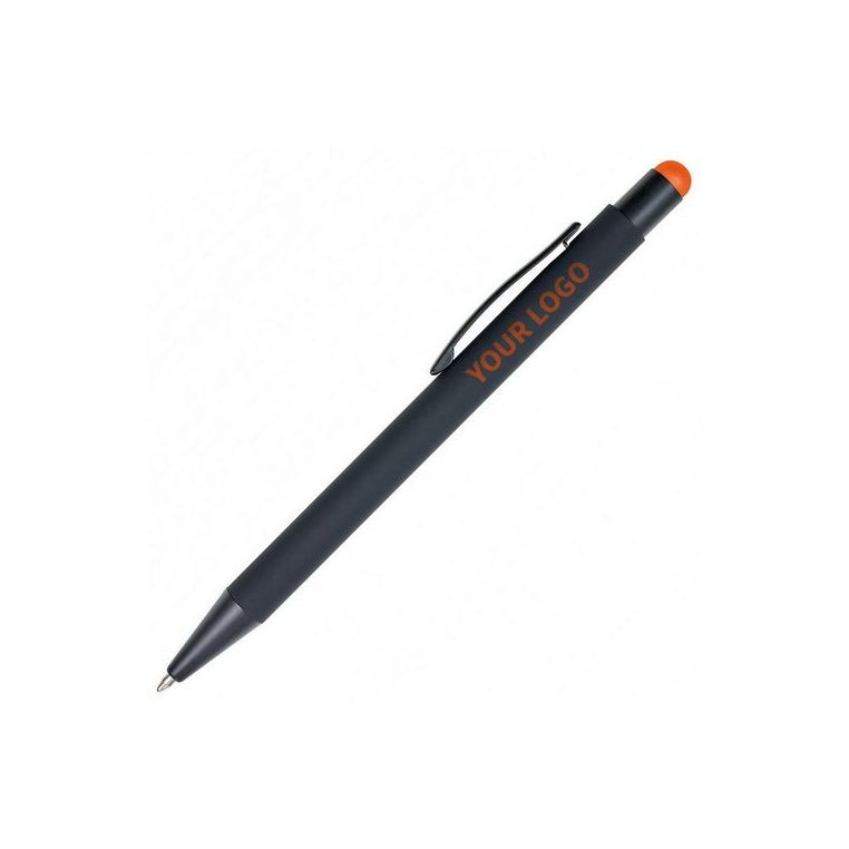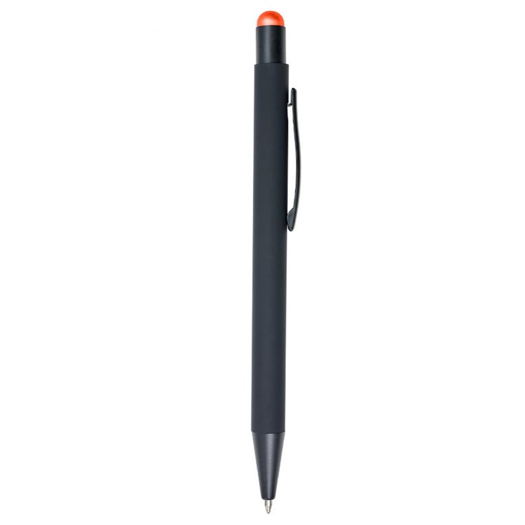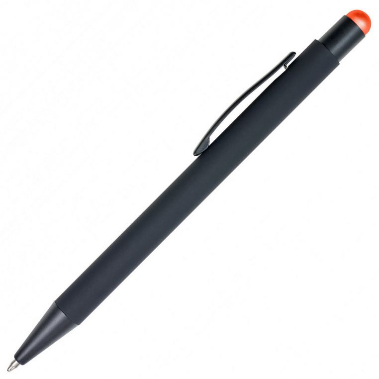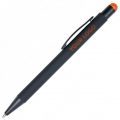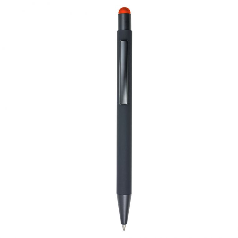 Кулькова прогумована ручка-стилус з алюмінію з кольоровим гумовим наконечником для роботи з сенсорним екраном. Кольорове гравіювання. Матеріали: алюміній, метал. Механізм – кнопковий.
