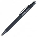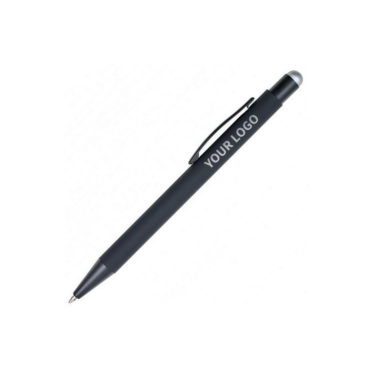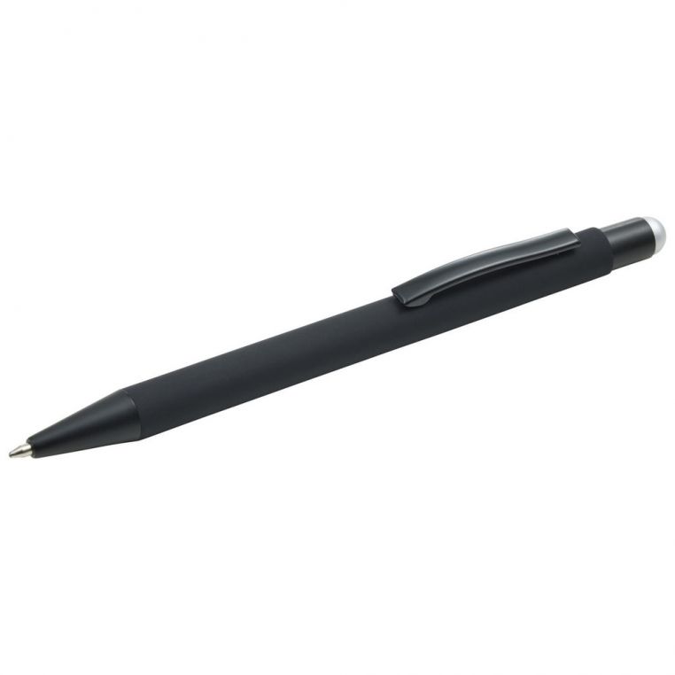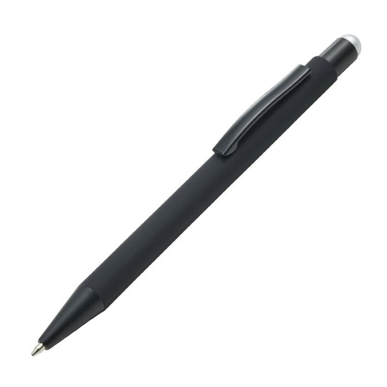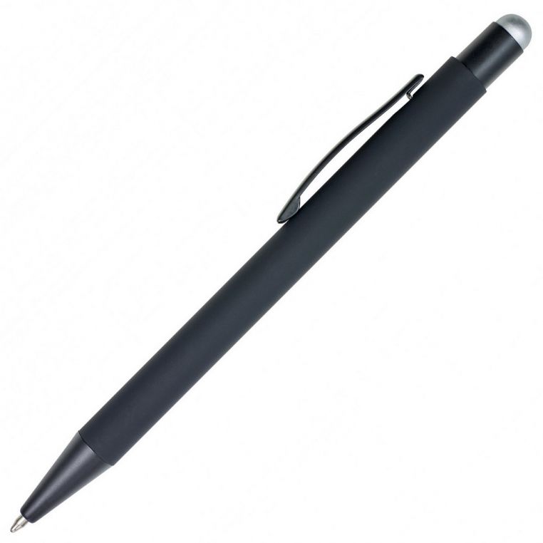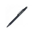 Кулькова прогумована ручка-стилус з алюмінію з кольоровим гумовим наконечником для роботи з сенсорним екраном. Кольорове гравіювання. Матеріали: алюміній, метал. Механізм – кнопковий.