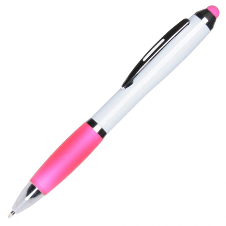 Багаторазова пластикова кулькова ручка-стилус із прогумованим грипом та металевим затиском. Ручка оснащена сенсорним наконечником для роботи із сенсорним екраном. Механізм – поворотний.