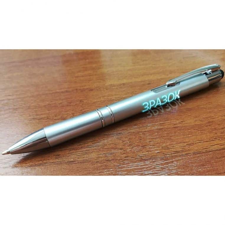 Пластикова кулькова ручка-стилус з металевим зажимом та можливістю LED гравіювання. Ручка підходить для роботи із сенсорним екраном. Стилус захищений пластиковим ковпачком. У ручку вбудовані світлодіоди, які дозволяють підсвітити вигравіруваний логотип. Тип живлення – три батарейки типу AG3 (входять до комплекту). Механізм – поворотний.