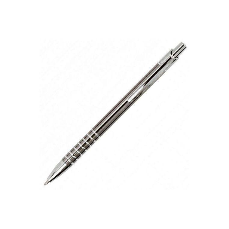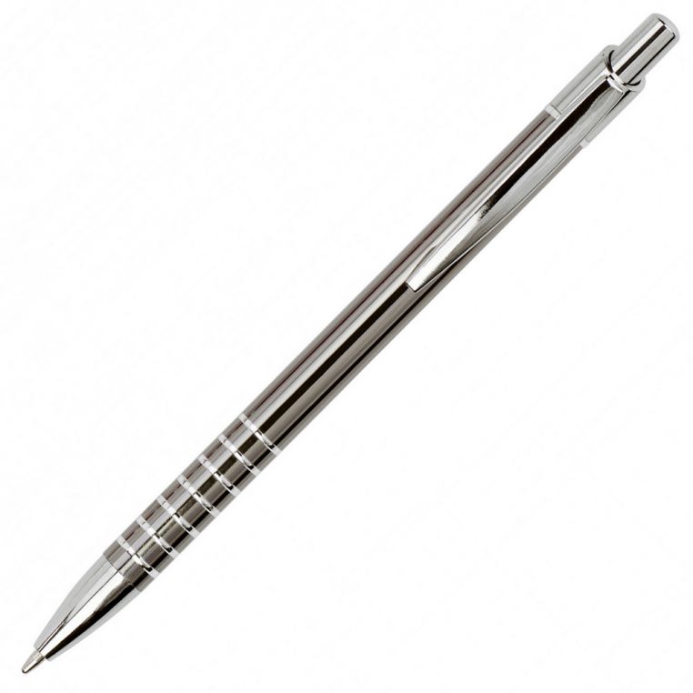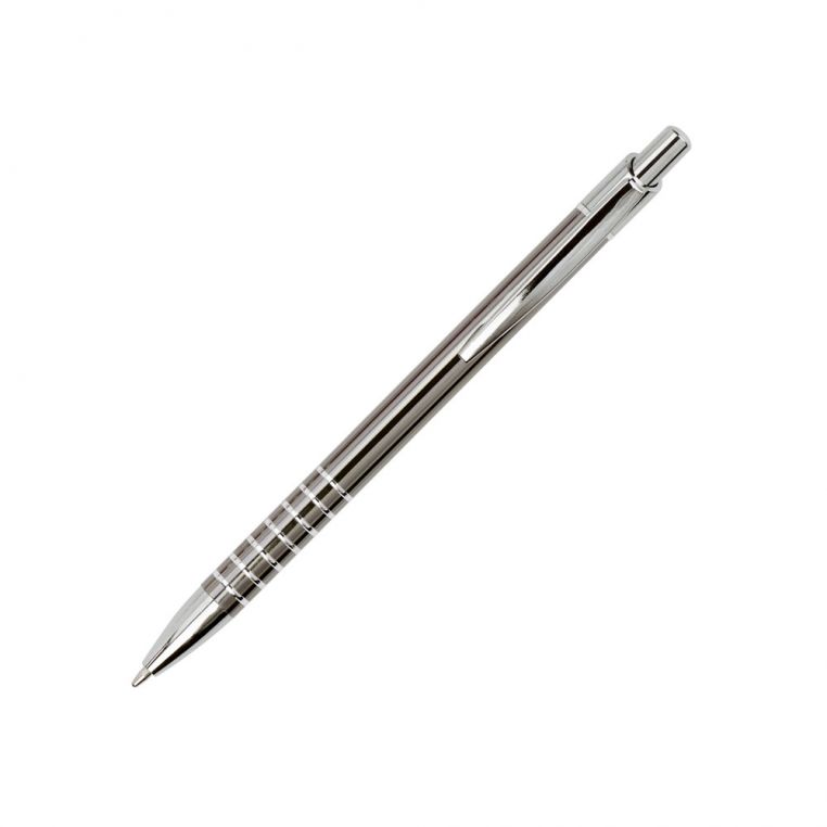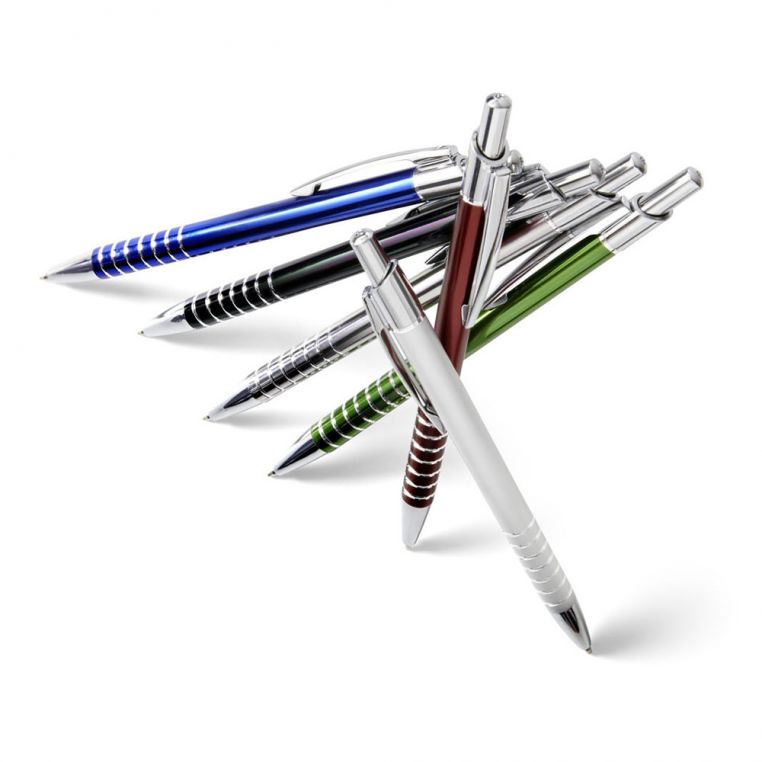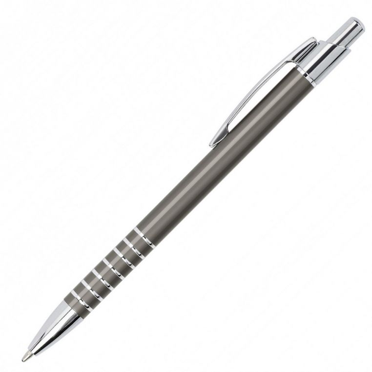 Яскрава багаторазова алюмінієва кулькова ручка. Біля основи ручка прикрашена кільцями. Матеріали: алюміній, метал. Механізм – кнопковий.
