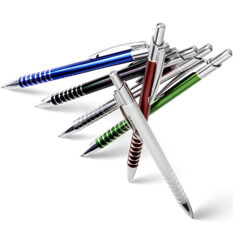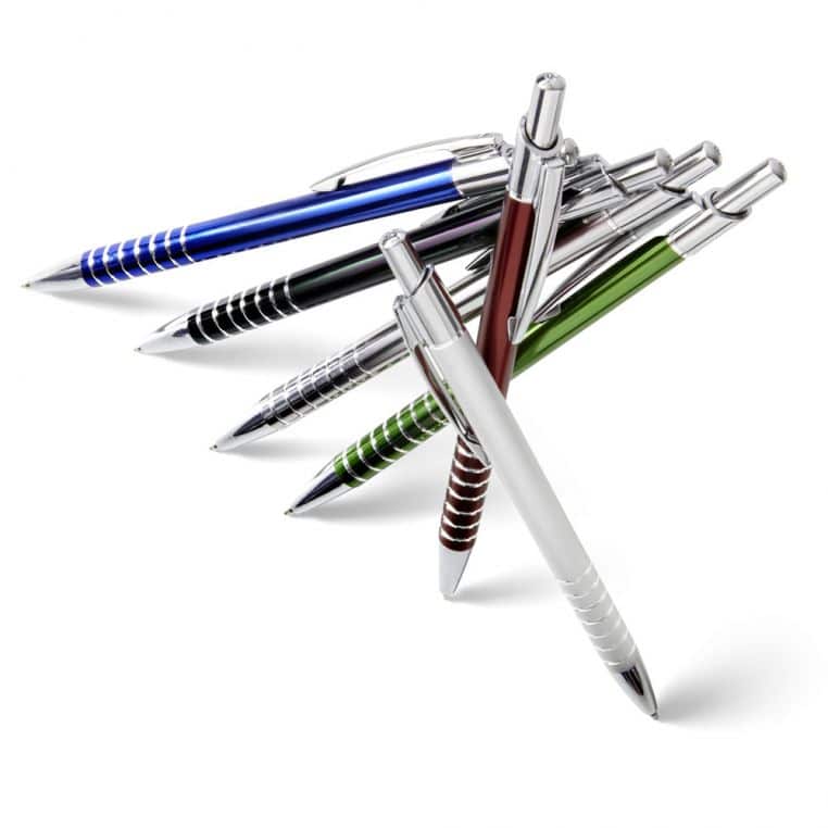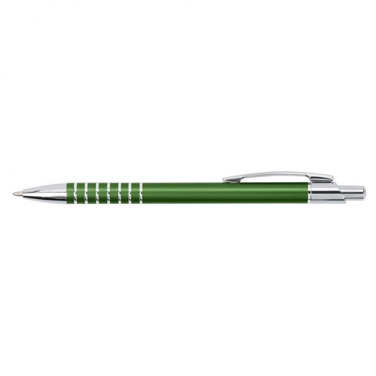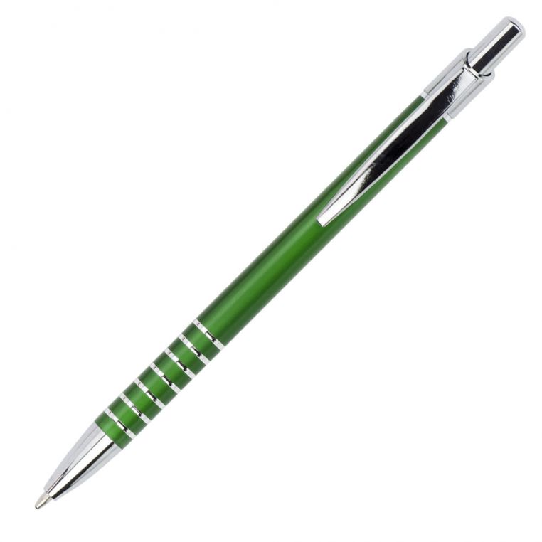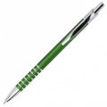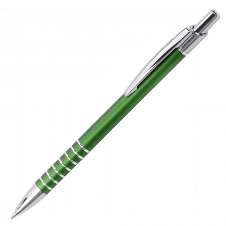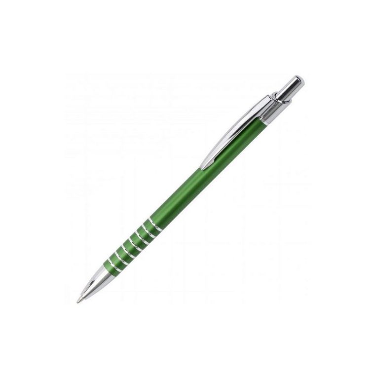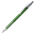 Яскрава багаторазова алюмінієва кулькова ручка. Біля основи ручка прикрашена кільцями. Матеріали: алюміній, метал. Механізм – кнопковий.