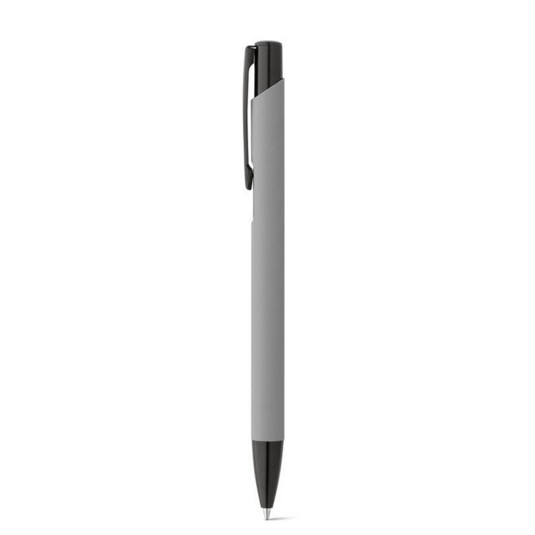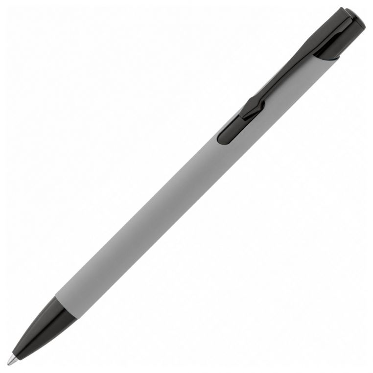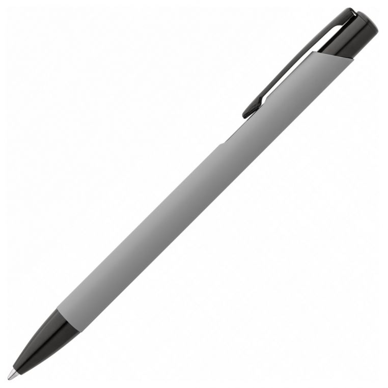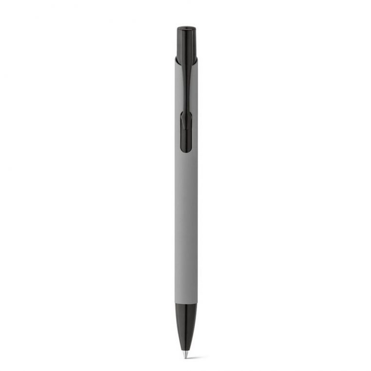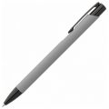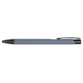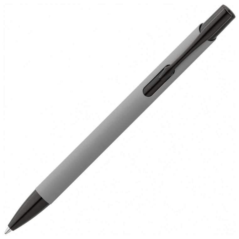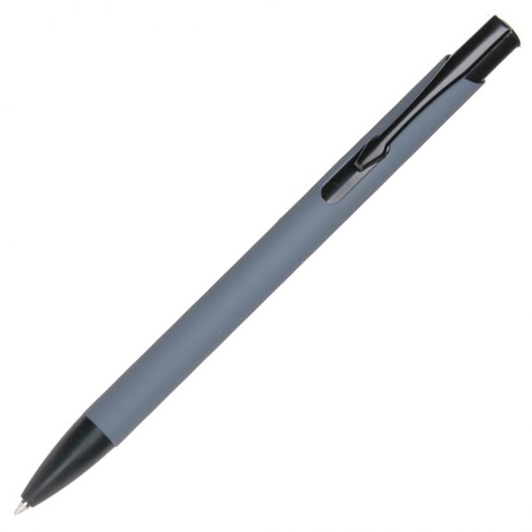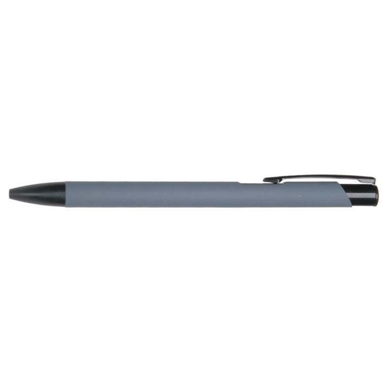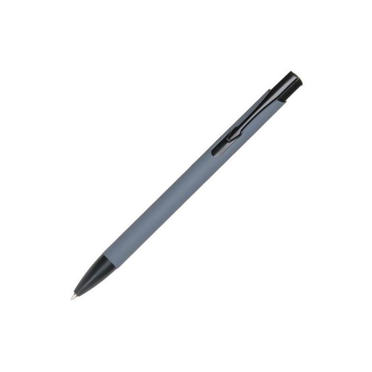 Алюмінієва кулькова ручка з покриттям Soft Touch. Кліп та носик чорного кольору. Механізм – кнопковий.