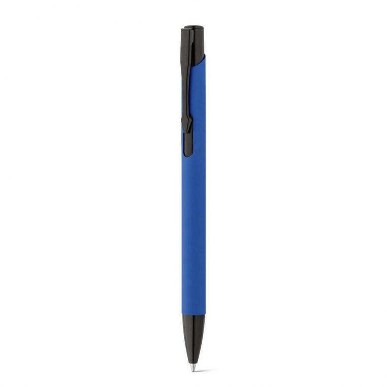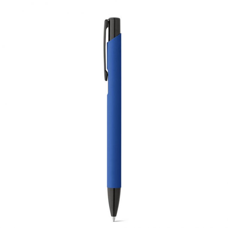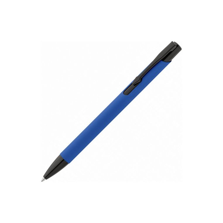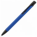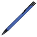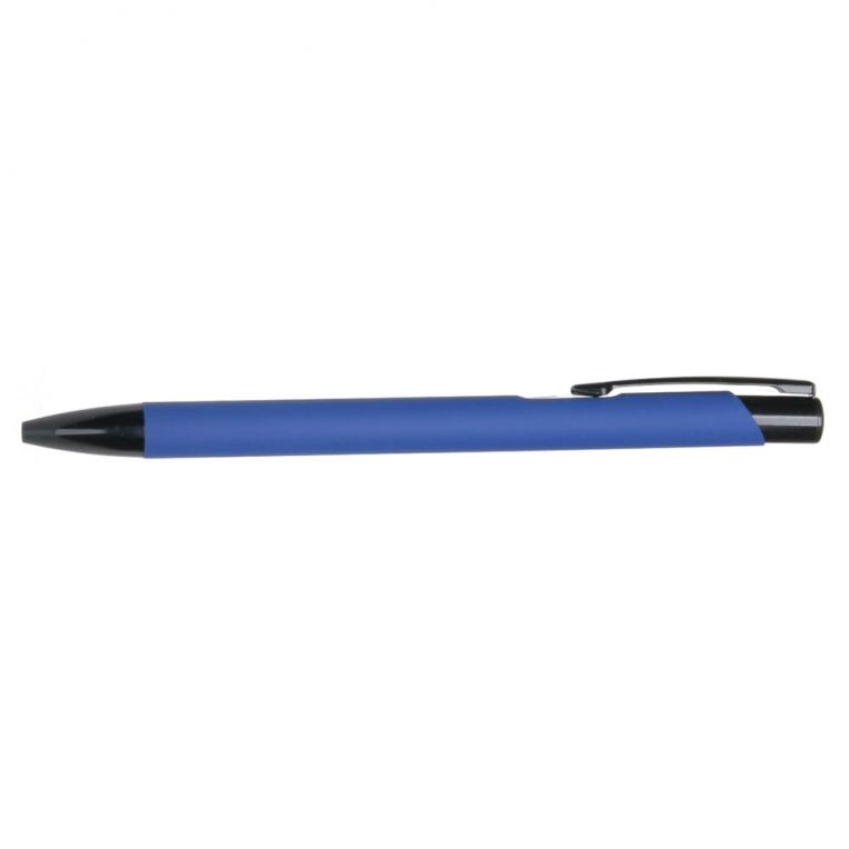 Алюмінієва кулькова ручка з покриттям Soft Touch. Кліп та носик чорного кольору. Механізм – кнопковий.