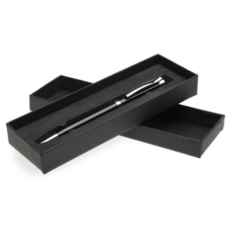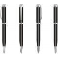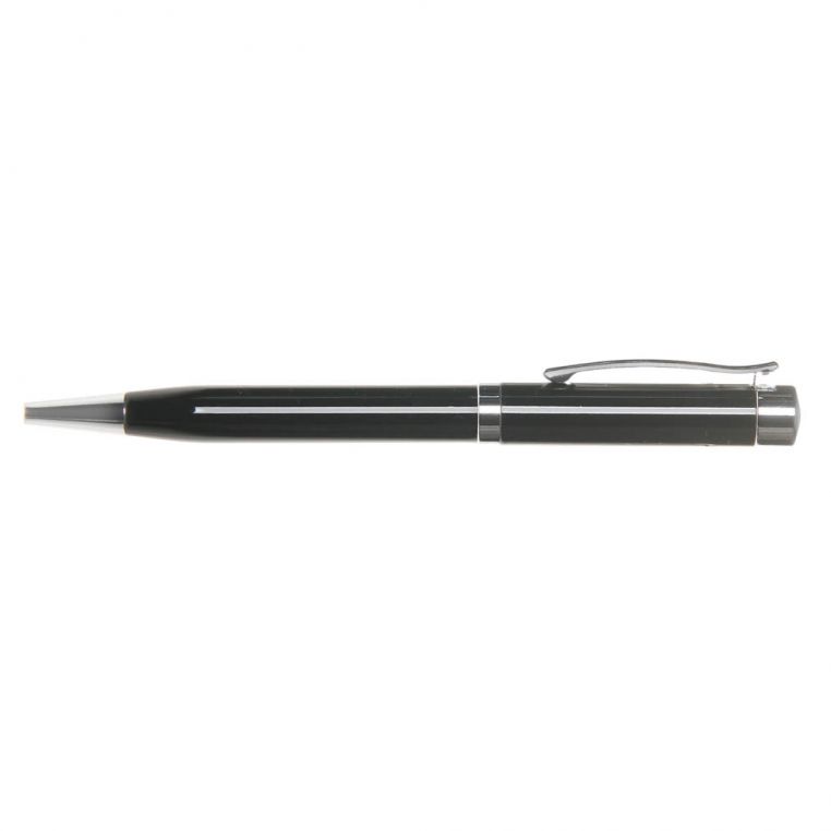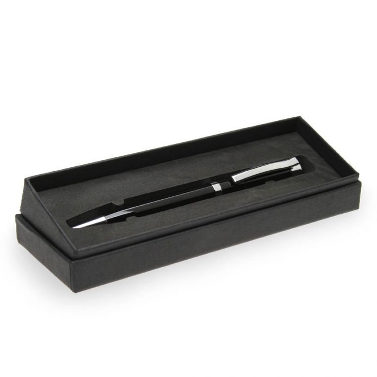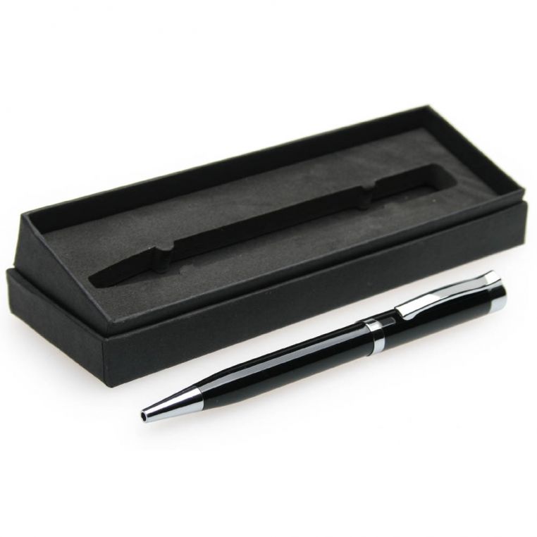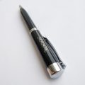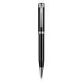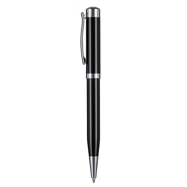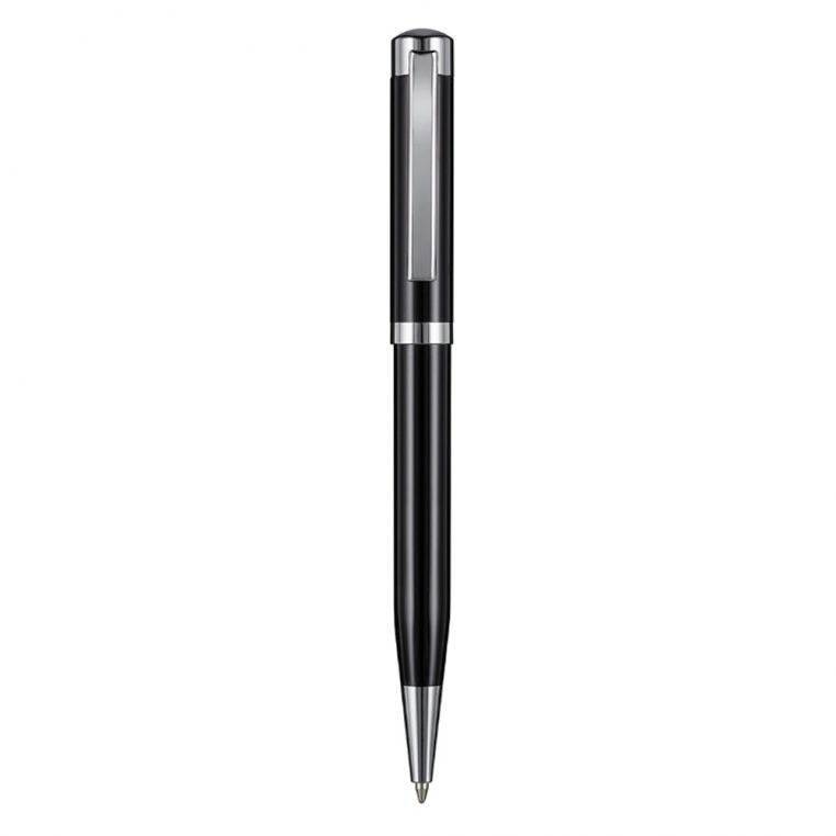 Багаторазова металева кулькова ручка у чорному глянцевому корпусі із дзеркальними хромованими деталями. Дзеркальне гравіювання. Стержень великої ємності типу “Ultra Metall” 1 мм, довжина лінії не менше 8500 м. Механізм – поворотний. Базовий колір пасти – синій.