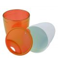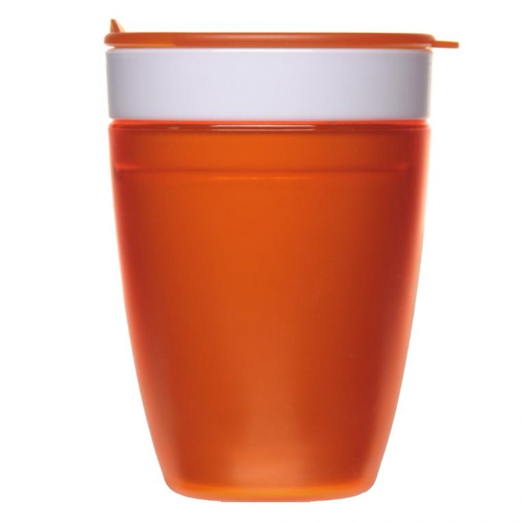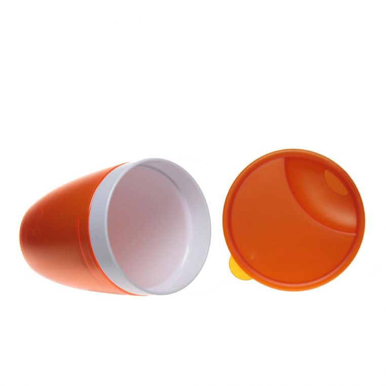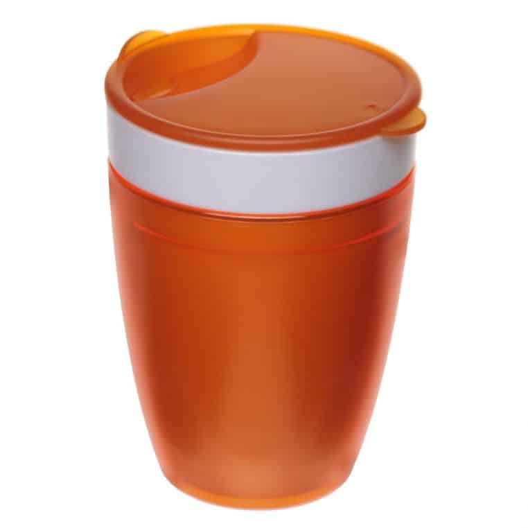 Двоскладна склянка об’ємом на 370 мл і 350 мл з кришкою. Виготовлена з міцного пластику. На крашці є невеликий отвір для пиття.