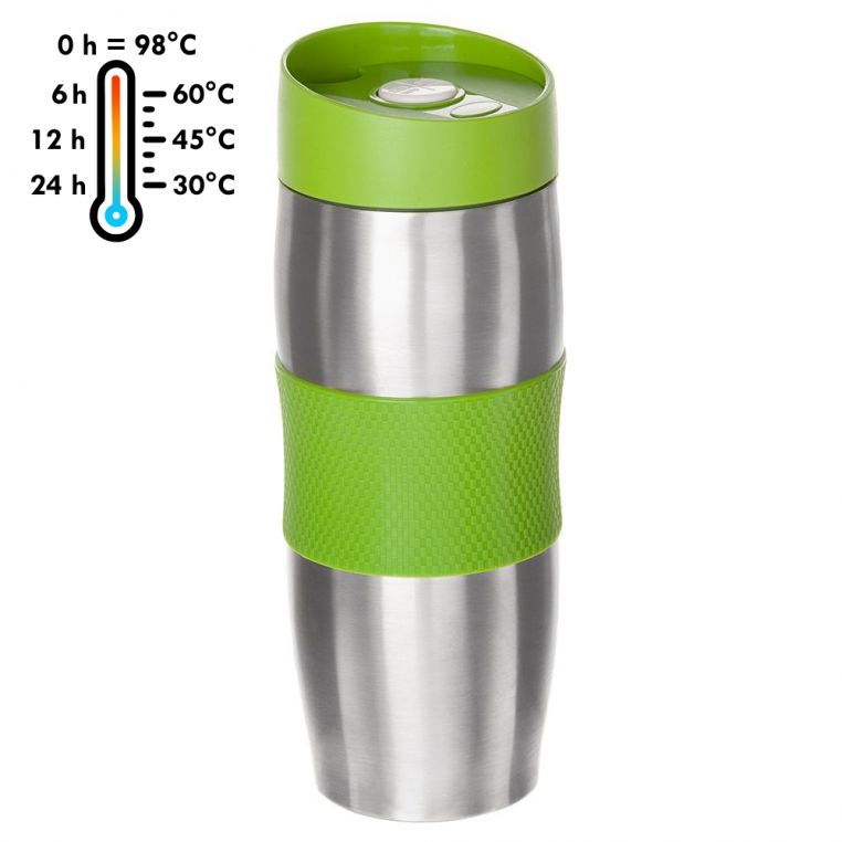 Термочашка з подвійними стінками з нержавіючої сталі. Надійна пластикова кришка з кнопкою OPEN/CLOSE та отвором для пиття. Для зручності утримання в руці чашка має силіконову вставку.