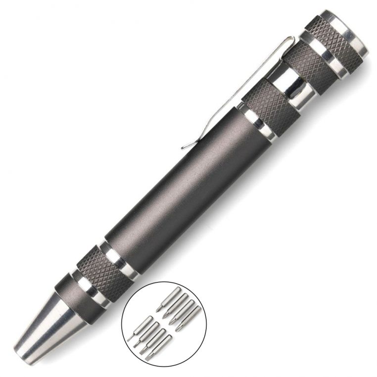 Металева викрутка у формі ручки з кліпом. Корпус служить футляром для насадок. До комлекту входять вісім насадок (чотири хрестові, чотири прямі). Кріплення насадок – магнітне.